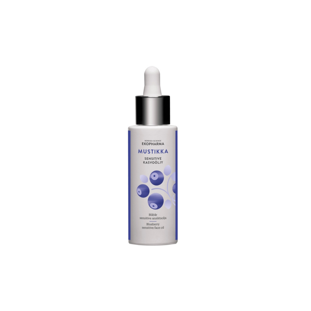 Ekopharma Mustikka kasvoöljy 30ml on hajusteeton, ihoa rauhoittava hoitoöljy herkälle iholle. Mustikan siemenöljy sisältää iholle välttämättömiä omega-rasvahappoja sekä ihoa ympäristöltä suojaavia antioksidantteja. Yhdessä jojobaöljyn ja skvalaanin kanssa ne ravitsevat ja hoitavat ihoa vahvistaen ihon luonnollista lipidisuojaa.