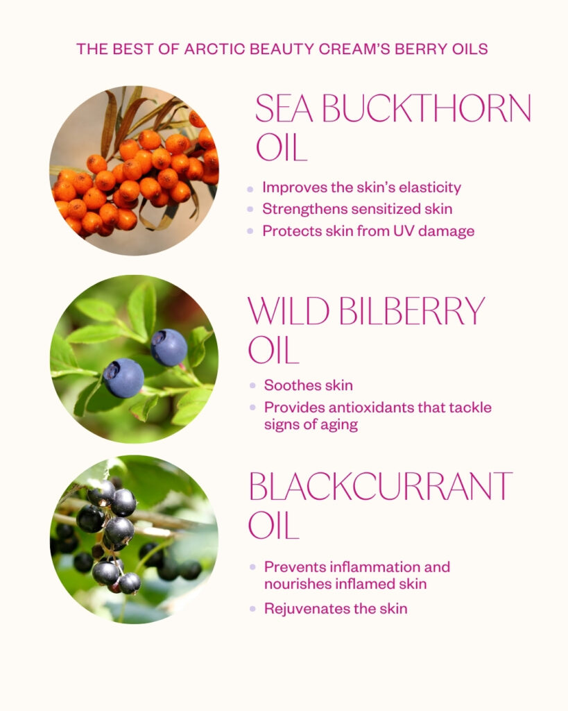 Arktisten marjojen siemenöljyt yhdessä bisabololin kanssa rauhoittavat punoituksia ja herkkää ihoa. Antioksidanttinen ja ravitseva koostumus, joka sopii kaikenikäisille kuivasta ihosta kärsiville.