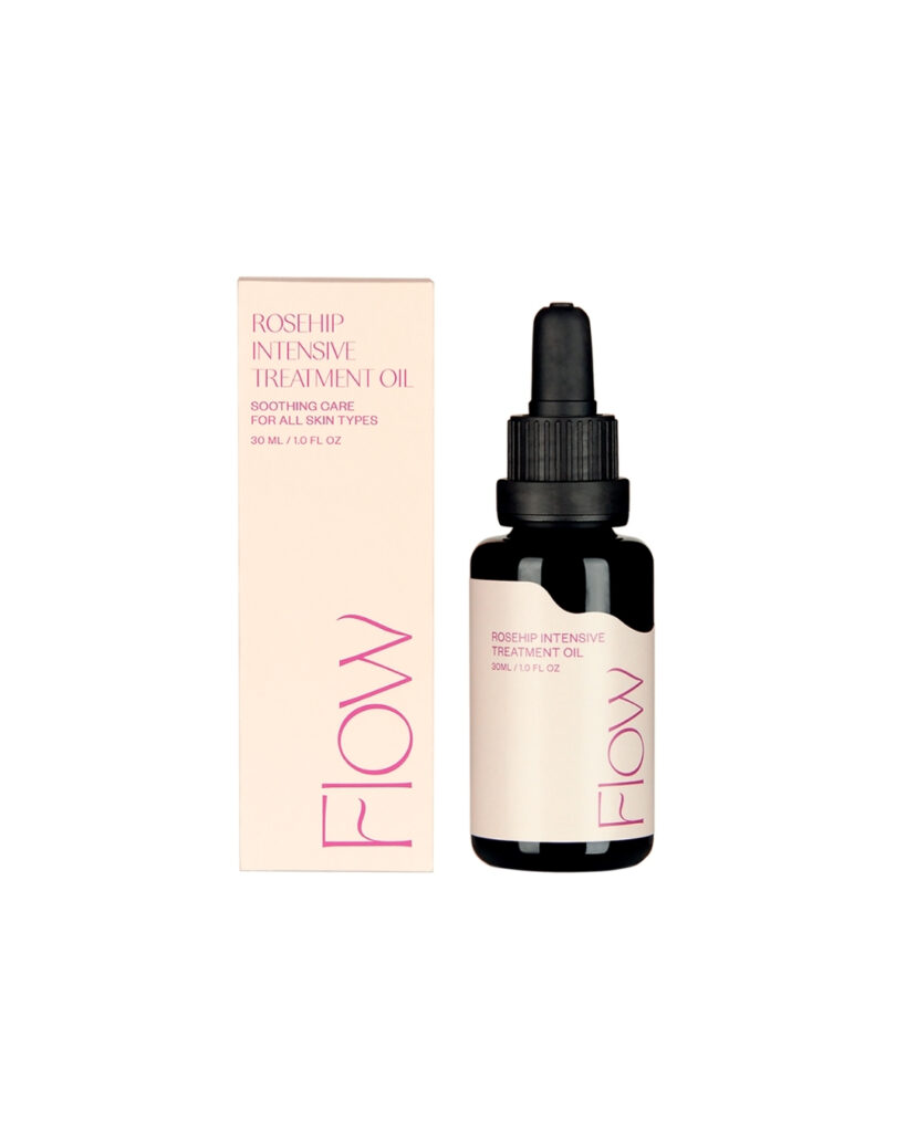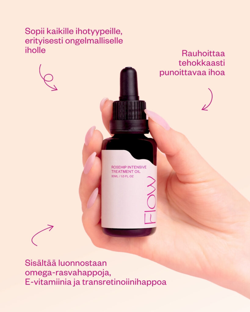Flow cosmetics – Rosehip Intensive Treatment Oil -kasvoöljy 30 ml, on tiivis koostumus ihon rakastamia tärkeitä omega-rasvahappoja, antioksidanttista E-vitamiinia ja ihoa kuntouttavaa transretinolihappoa. Sopii kaikille ihotyypeille. Hoitoöljy tasapainottaa sekaihon ja rasvoittuvan ihon talineritystä ja on erityisen sopiva ruusufinnille ja couperosa-iholle. Myös kuiva, herkkä tai atooppinen iho rakastaa tätä ravitsevaa ja helposti imeytyvää öljyä. Rosehip Intensive Treatment Oil kosteuttaa ihoa sekä hidastaa ryppyjen ja juonteiden syntymistä. Parantaa ihon kimmoisuutta. Käytä myös arpien, aknearpien, aurinkoihottuman ja auringon polttamien hoitoon.