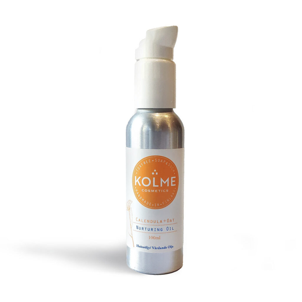 Kolme Cosmetics Hoitoöljy Kehäkukka & Kaura on ravitseva koko vartalon hoitoöljy kaikille ihotyypeille, myös ongelmaiholle. Erittäin nopeasti imeytyvä monitoimitöljy kasvoille ja vartalolle. Suojaa, kosteuttaa, rauhoittaa ja pehmentää ihoa. Ei sisällä säilöntäaineita, hajusteita eikä eteerisiä öljyjä, joten se sopii loistavasti myös herkkäihoisille, atoopikoille, hajuste-ja kemikaaliyliherkille sekä lapsille ja vauvoille. Kosteuttaa ihoa tehokkaasti tekemättä ihoa rasvaiseksi.